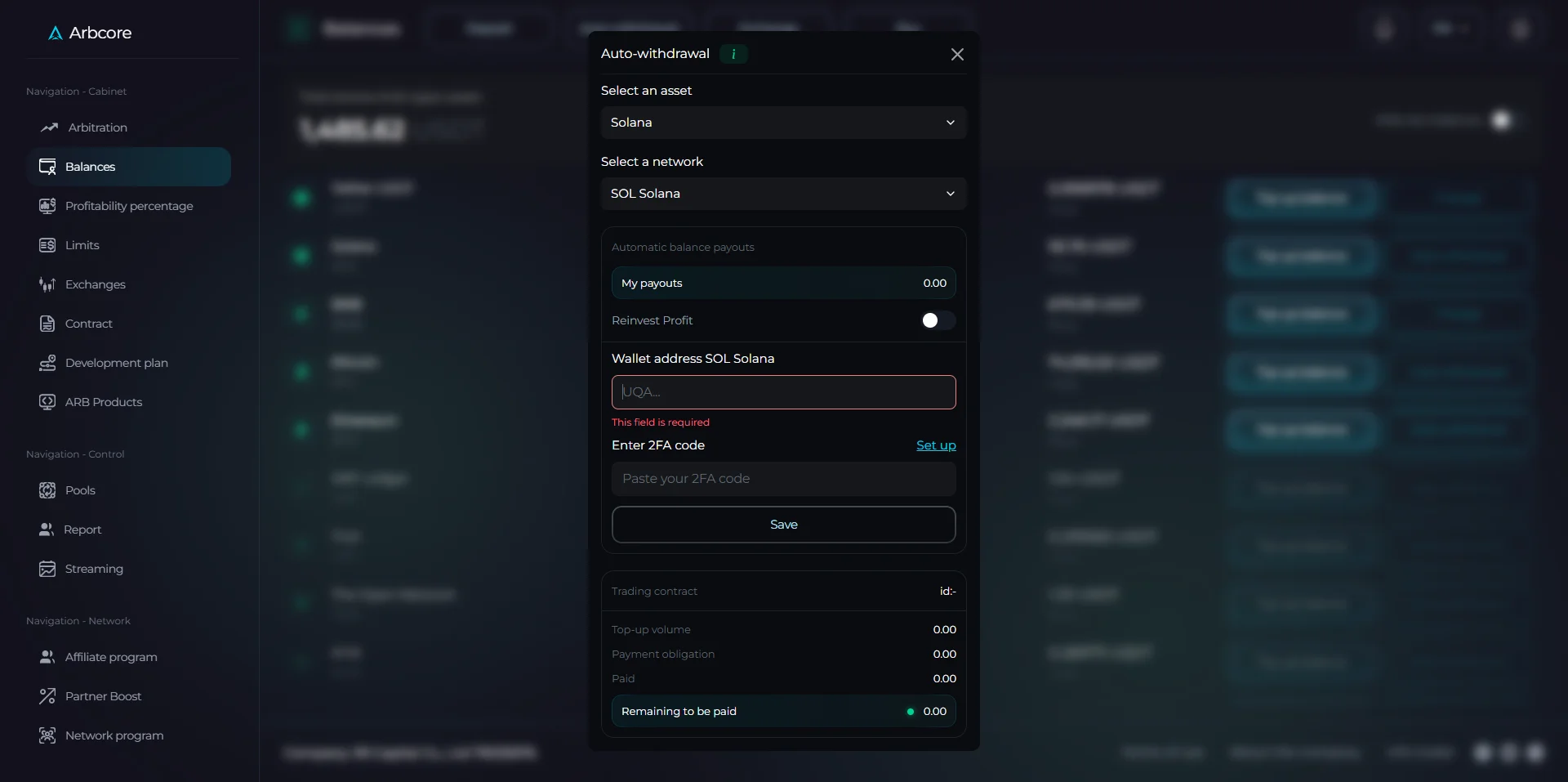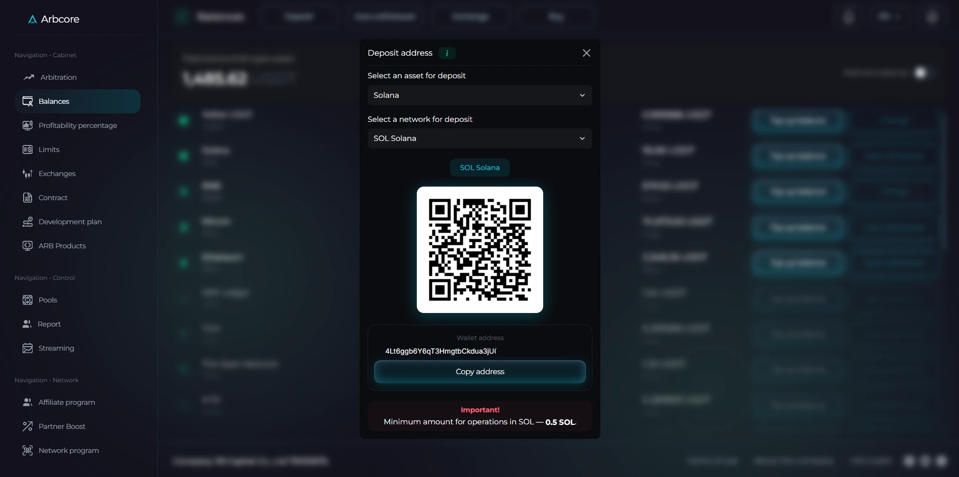 Log in to the ARBCORE website. Navigate to Cabinet → Balances. You will see your full asset list — choose the asset that matches your strategy and tap "Top up balance" next to it.